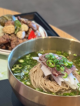 제주 광평리에서 재배한 100% 순메밀 제주 냉면을 맛볼 수 있는 곳입니다. 코엑스 인근 본점의 인기에 이어 강남역 인근에서도 이 맛을 볼 수 있는 직영점이 생겼습니다. 대표 메뉴인 평양냉면은 단아한 그릇에 정갈하게 담겨 나오는데 예쁜 면똬리만 봐도 조리장의 내공을 짐작할 수 있습니다. 면 사리 위는 배, 절인 무, 열무, 아롱사태 수육이 큼지막하게 올라있습니다. 똬리를 젓가락으로 슬슬 풀어서 맛보면 면의 구수한 메밀향이 느껴지는 것이 일품입니다. 이 구수한 향이 육수에도 배어들어 먹을수록 당깁니다. 면발은 적당히 탄력 있으면서 질기지 않아 속이 편안합니다.