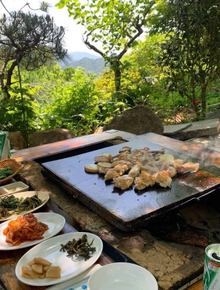 야외에서 먹는 숯불 돌판 토종 닭 구이 맛집 '풀꽃농원'입니다. 지리산 피아골 중턱에서 직접 기른 닭을 손질해 숯불 위 돌판에서 구워 먹는 곳입니다. 별다른 양념을 사용하진 않지만 담백하고 고소한 닭 구이를 맛볼 수 있습니다. 곁들임 반찬으로 3색 나물과 김치가 푸짐하게 나와 맛의 풍성함을 더합니다.