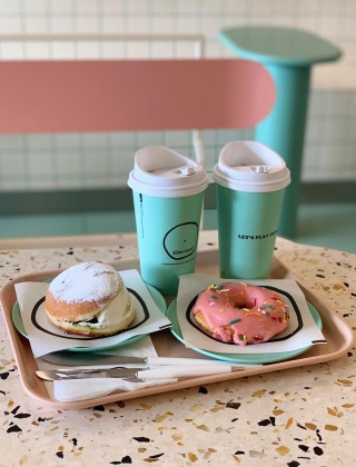 파스텔톤 민트색 외벽에 분홍색 도넛이 크게 자리 잡고 있는 모습이 인상적인 '두넛샵'입니다. 아기자기한 가구들과 도넛 모형으로 장식되어 있어 마치 외국의 도넛 가게를 연상시킵니다. 대표 메뉴는 만화 속 나오는 도넛의 모양을 쏙 빼닮은 'RASPBERRY DONUT'입니다. 도넛 속에는 라즈베리 필링이 가득 차 있어 상큼 달콤한 맛이 매력적인 도넛입니다.