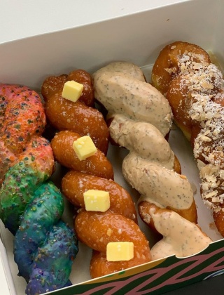 100℃의 끓인 물과 감자를 넣어 만든 탕종 공법으로 수제 꽈배기를 만드는 ‘꽈페’입니다. 꽈배기는 수분 함량이 높아 촉촉함과 찰진 식감이 특징입니다. 대표 메뉴 ‘유니콘 트위스트’는 꽈배기 도넛에 무지갯빛 설탕 시럽을 얇게 입혀 눈과 입을 만족시켜줍니다. 꽈배기를 씹는 순간 팝핑 캔디가 톡톡 터지며 재밌는 식감을 더합니다.