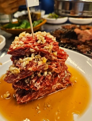 Q.이곳 고기의 특징은 무엇인가요?A.갈빗살과 토시살 등 소고기 구이를 연탄불에 굽고, 고기 표면에 마늘을 듬뿍 올려 양념한 점이 특징으로 언급됩니다.