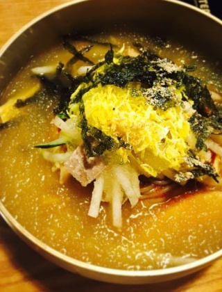 ‘박군자 진주냉면’은 진주 중앙시장에서 진주냉면을 판매해오던 하거옹, 황덕이 부부의 첫째 아들 부부가 운영하는 곳입니다. 집안 대대로 내려온 전통 레시피를 고수하여 부모님의 손맛을 고스란히 재현합니다. 대표 메뉴는 면 위로 두툼하게 부친 육전과 얇게 채 썬 달걀 지단을 소복이 쌓은 ‘진주 물냉면’. 소뼈, 사태, 양지를 12시간 이상 끓인 육수를 사나흘 정도 숙성시킨 뒤 마른오징어, 황태, 밴댕이 등의 해산물을 넣고 한 번 더 우려 깊은 국물 맛을 완성했습니다. 팔팔 끓는 육수를 3~4시간 동안 막대기로 저어준 후 불에 달군 쇠 봉을 넣어 잡내는 제거하고 개운한 맛은 한껏 살렸습니다.