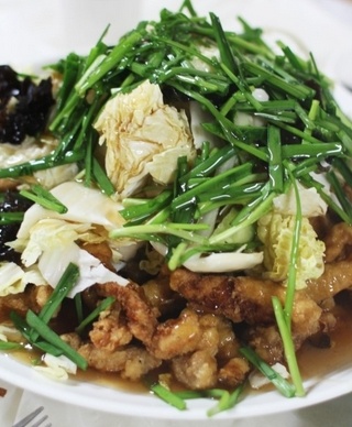 배추와 부추를 얹은 독특한 탕수육