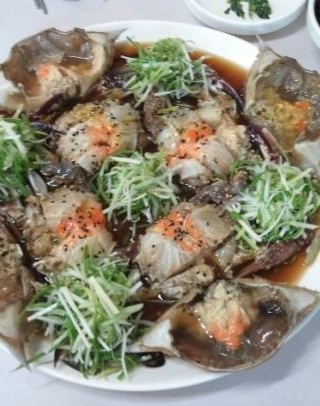 파채를 곁들인 비리지않고 짜지 않은 슴슴한 맛의 꽃게장! 크기가 작은것 빼고는 맛있습니다!