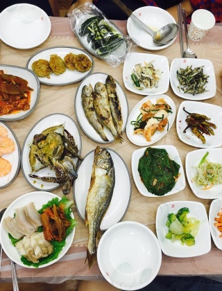 Q.007식당은 어떤 종류의 음식을 중심으로 한 상이 차려지나요?A.굴비정식을 기본으로 부세 보리굴비, 각종 생선구이와 회, 조기매운탕 같은 탕류, 떡갈비와 홍어삼합 등 다양한 반찬이 한상 가득 차려지는 구성입니다.