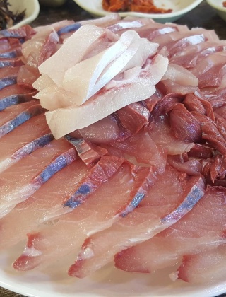하모리에 위치한 ‘부두식당’은 44년 동안 맛의 전통을 이어가고 있는 대표적인 대물림 맛집으로 3월 중순부터 7월 초까지는 ‘자리물회’가 그 이외의 기간에는 ‘방어’가 이곳의 대표 인기 메뉴입니다. 도톰한 방어회는 부드러운 식감과 고소한 맛이 특징입니다. 배꼽까지 이어지게 썰어낸 뱃살은 씹을수록 더욱 진하게 느껴지는 풍미가 일품입니다. 간장보다는 초장에 찍어서 마늘, 고추를 올린 상추에 싸서 먹으면 더욱 맛있게 즐길 수 있습니다. 살코기에 비해 기름기가 많지 않아 개운한 맛을 자랑하는 방어 지리도 별미이며 라면사리도 추가 가능합니다.