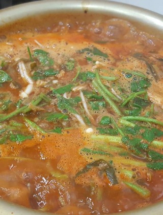 구리 전통시장 안쪽 작은 식당인 충북추어탕은 40년 전통의 노포 식당으로, 리모델링 후 실내가 무척 깔끔하고 테이블마다 버너와 화구가 있어 추어탕을 계속 끓여가며 따끈하게 먹을 수 있습니다. 고추장 베이스의 매운탕 스타일 추어탕은 미꾸라지가 듬뿍 들어가 칼칼하면서도 시원한 맛과 깊은 맛이 살아 있어 해장용으로도 잘 어울립니다.