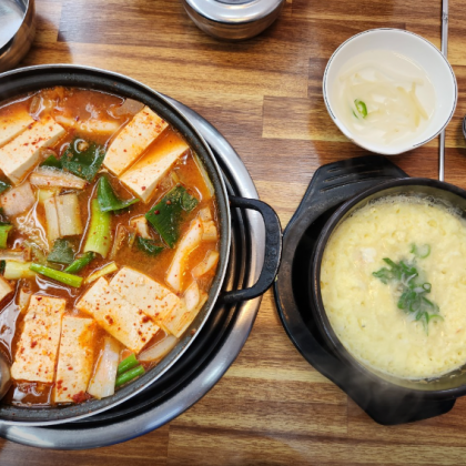 Q.이 집 김치전골 맛의 특징은 무엇인가요?A.1년 숙성 한국산 김치와 직접 만든 두부, 고기가 어우러져 국물이 매콤하면서도 칼칼하고 깊은 맛을 내며 시원하고 개운한 느낌을 줍니다.