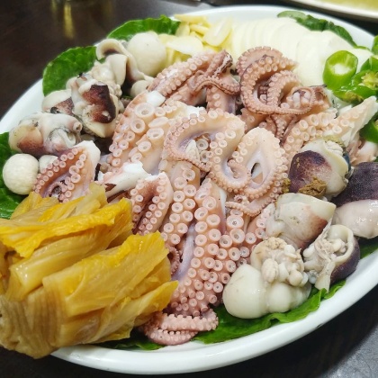 Q. 오징어회와 낙지숙회는 어떤 식감과 맛이 느껴지나요?A.오징어회와 낙지숙회는 국수 가락처럼 길게 썰어져 윤기가 돌며 쫄깃한 식감과 탱글탱글한 식감이 특징이고, 참기름장이나 쌈장, 초장 등 네 가지 장과 쌈채소와 함께 먹으면 고소한 맛과 다양한 풍미를 느낄 수 있다.