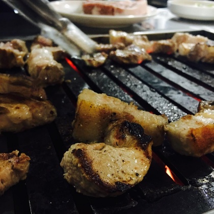 연탄불에 구워 먹는 두툼한 돼지고기