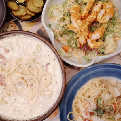 [2인세트] 까르보나라 + 갈릭새우알리오올리오 + 케이준샐러드 + 음료 1잔