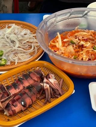 ‘오징어난전 거리’는 동명항에서 금강대교와 설악대교가 이어지는 길목에 난전들이 길게 늘어져 있는 곳입니다. 푸른 바다가 펼쳐진 항구에 고깃배들 오가는 풍경이 운치를 더합니다. 각각의 식당에서는 어선으로 갓 잡아 올린 제철 해산물을 맛볼 수 있습니다. 겨울철 대표 메뉴는 은빛으로 반짝거리는 표면에서 신선함이 느껴지는 ‘양미리’. 굵은 소금을 뿌린 양미리는 벌겋게 달아오른 연탄불 위에서 은근하게 익히는 구이 방식이 가장 인기입니다. 불 향과 함께 노릇하게 익은 양미리구이는 알이 실하게 차있는 암놈과 정소가 들어 있어 고소한 맛을 자랑하는 수놈 두 가지 맛을 골라 즐기는 재미가 있습니다.