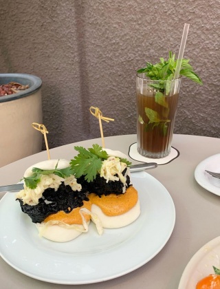 ‘파운드 로컬’은 낮엔 브런치 카페로 저녁에는 칵테일이나 와인을 마실 수 있는 바로 운영합니다. 싱그러운 초록빛 식물들로 채워져 보기만 해도 시원한 느낌을 주는 테라스는 정원 속에 와있는 듯한 느낌을 줍니다. 대표 메뉴는 바오 번 사이 스파이시 마요 소스, 오징어 먹물 반죽으로 튀긴 닭 다리 살, 코울슬로, 고수를 차례대로 쌓은 ‘블랙치킨 바오번’입니다. 담백한 맛과 촉촉한 식감을 지닌 번이 바삭한 닭 다리 살 튀김을 보드랍게 감싸주며 조화롭게 어울립니다. 느끼할 수 있는 닭 다리 살 튀김을 매콤한 마요 소스와 상큼한 코울슬로가 깔끔하게 잡아줍니다. 고수를 선호하지 않는다면 주문할 때 미리 말하는 것을 추천합니다.