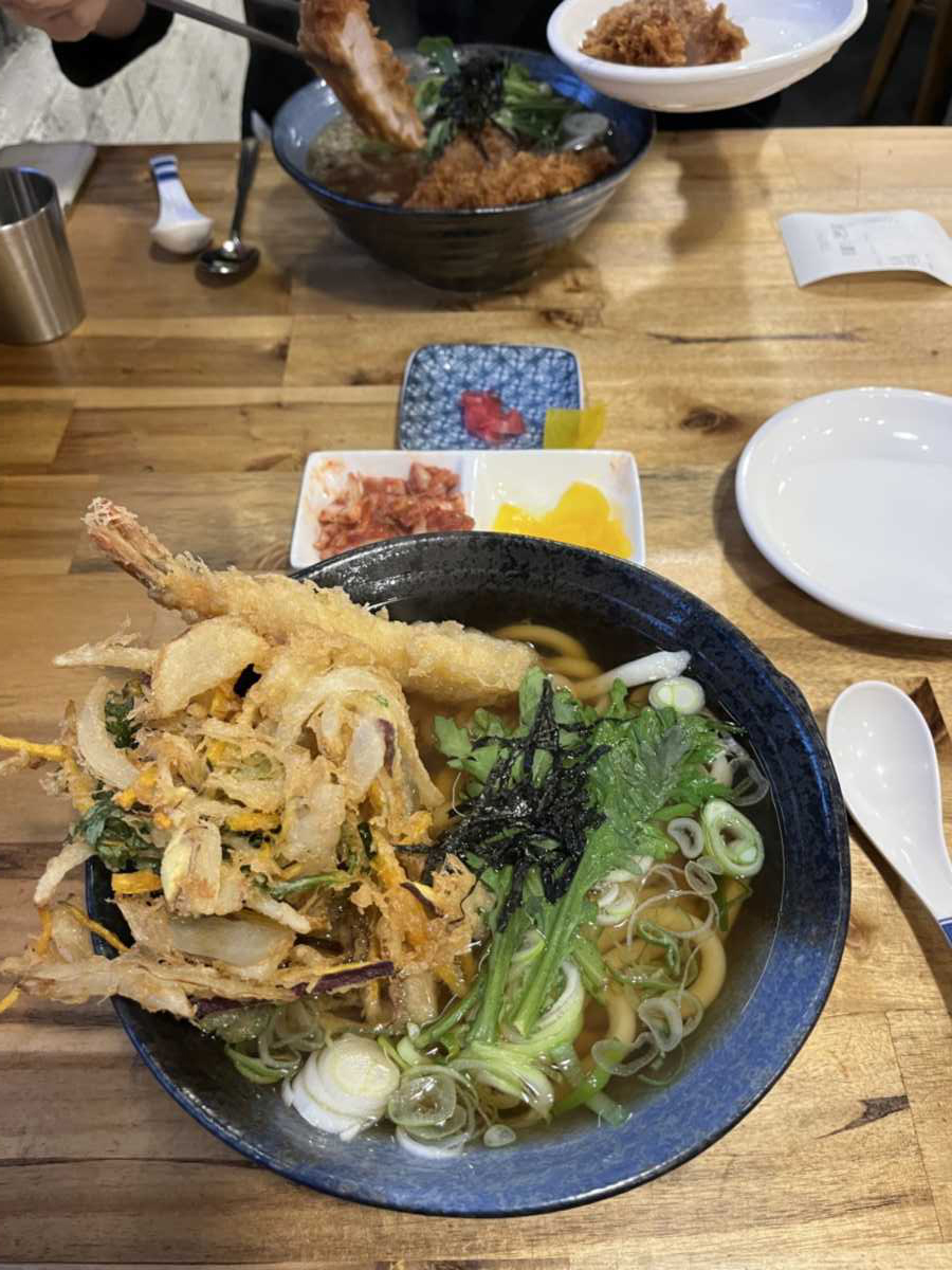 A. 차가운 쯔유에 닭튀김을 곁들인 토리텐 붓카케 우동과 겨울철 인기 메뉴 텐뿌라우동.
