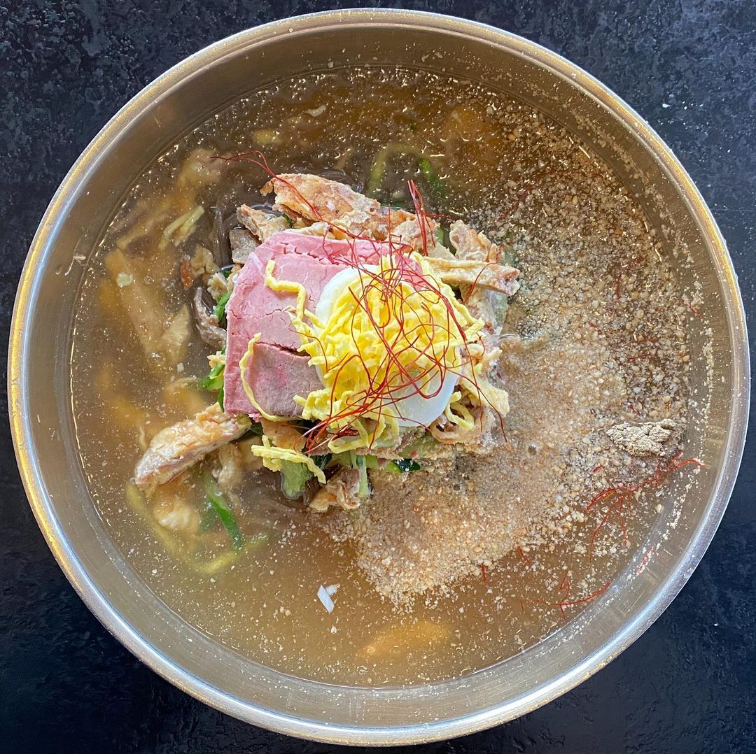 알록달록한 고명이 올려진 진주냉면 한 그릇을 마주하면, 마치 화려한 한복을 보는 듯한 느낌이 든다. 노란 지단, 하얀 달걀 흰자, 붉은 실고추, 초록 오이, 그리고 갈색 육전. 색동저고리처럼 다채로운 색감이 눈을 즐겁게 하고, 한 숟가락 떠먹으면 입안에서는 담백한 육수와 쫄깃한 면, 부드러운 육전이 어우러지며 조화로운 맛의 향연이 펼쳐진다.
