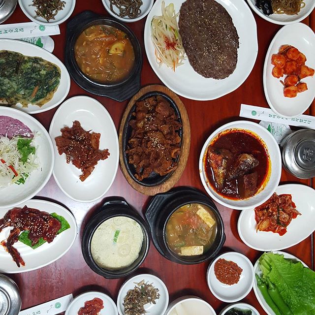 메뉴: 한정식 단일 구성(소불고기/돼지불고기, 각종 나물·반찬, 된장찌개 등)