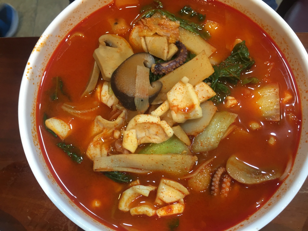 A. 주문 즉시 제면기에서 뽑아내는 생면을 사용해 탱글한 식감이 살아 있어요. 직접 만든 고추기름과 청양고추를 듬뿍 넣어 매운 향이 선명하고, 소라·멍게·새우·오징어·홍합 등 20여 가지 해산물이 어우러져 깊고 시원한 국물 맛을 완성해요. 불맛이 은은하게 더해지는 점도 포인트예요.