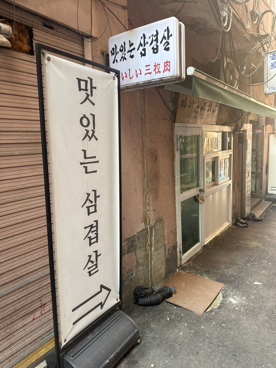 남대문시장 골목 깊숙한 곳에 자리한 ‘맛있는삼겹살’은 40년 넘게 자리를 지켜온 노포 삼겹살집이다. 간판의 이름처럼 “진짜 맛있는 삼겹살”이라는 말이 과하지 않게 들리는 곳으로, 시장 상인들과 인근 직장인들이 꾸준히 찾는 단골집이다. 메뉴는 생삼겹과 고추장삼겹살, 그리고 볶음밥으로 단출하게 구성되어 있는데, 그중에서도 단짠의 중독성이 또렷한 고추장삼겹살의 선호도가 높다. 고기는 주방에서 초벌을 넘어 거의 완성에 가깝게 구워져 나오기 때문에 테이블에서는 굽는 수고 없이 바로 맛에 집중할 수 있다. 기본 반찬도 김치, 대파김치, 무생채, 파채, 콩나물국 등으로 푸짐하게 차려져 고기와의 궁합을 자연스럽게 받쳐준다. 식사의 하이라이트로 꼽히는 볶음밥은 이 집을 다시 찾게 만드는 이유로, 고기를 5~6조각 정도 남겨 특제소스와 함께 볶는다. 남겨둔 고기가 없다면 주문이 불가하니 추가로 반 인분을 더 주문해서라도 맞춰 먹어야 한다. 날씨가 좋은 날에는 야외 자리에 앉아 시장의 소리와 공기를 함께 느끼며 식사할 수 있어, 시장의 낭만이 배경이 된다.