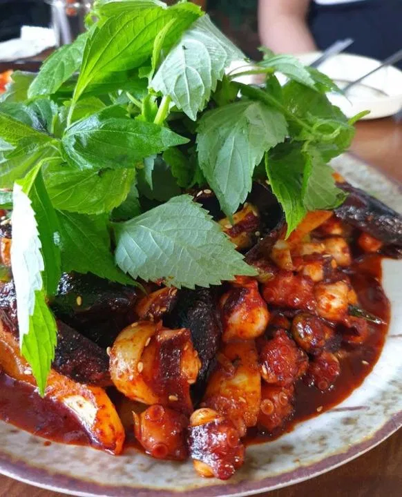 A. 흑돼지, 돌문어, 전복을 돌냄비에 담아낸 ‘제왕삼합’이 대표 메뉴입니다. 매콤달콤한 과일소스 양념이 감칠맛을 더합니다.