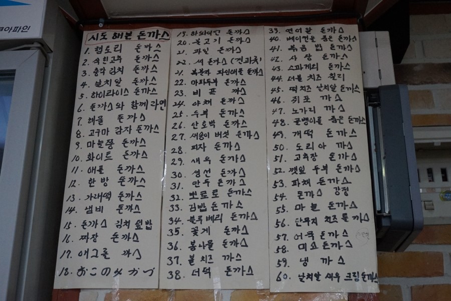 사람들로 가득한 내부 한 쪽에는 지칠줄 모르는 도전 정신으로 그 동안 시도해본 기상천외한 돈가스들이 줄줄이~
