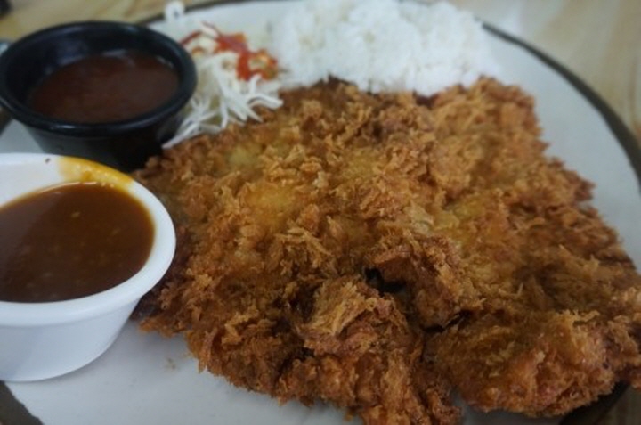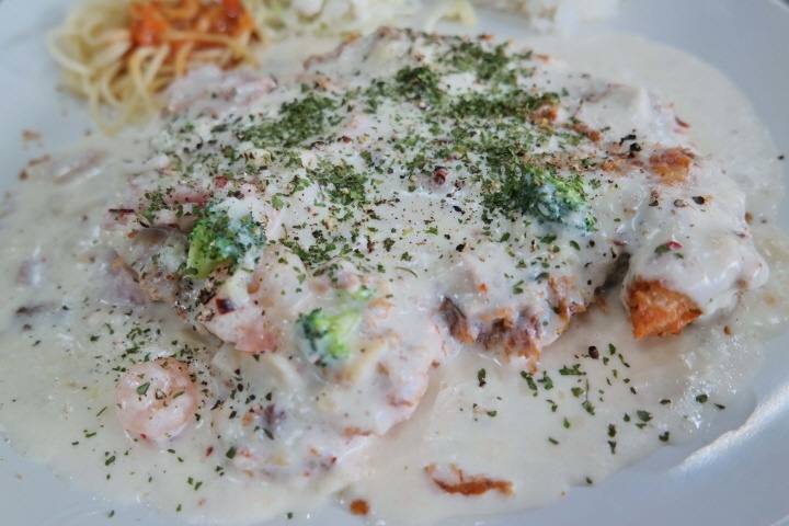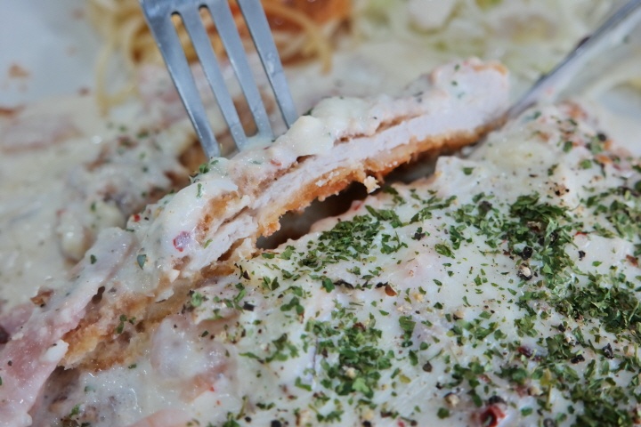 새우, 베이컨, 브로콜리 등이 들어간 크림소스를 한 껏 머금은 돈가스!