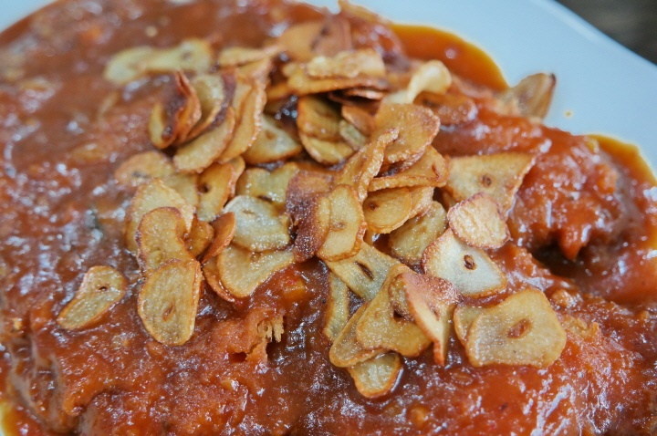 특제 칠리소스와 기름에 바삭하게 튀긴 슬라이스 후레이크 마늘이 포인트!