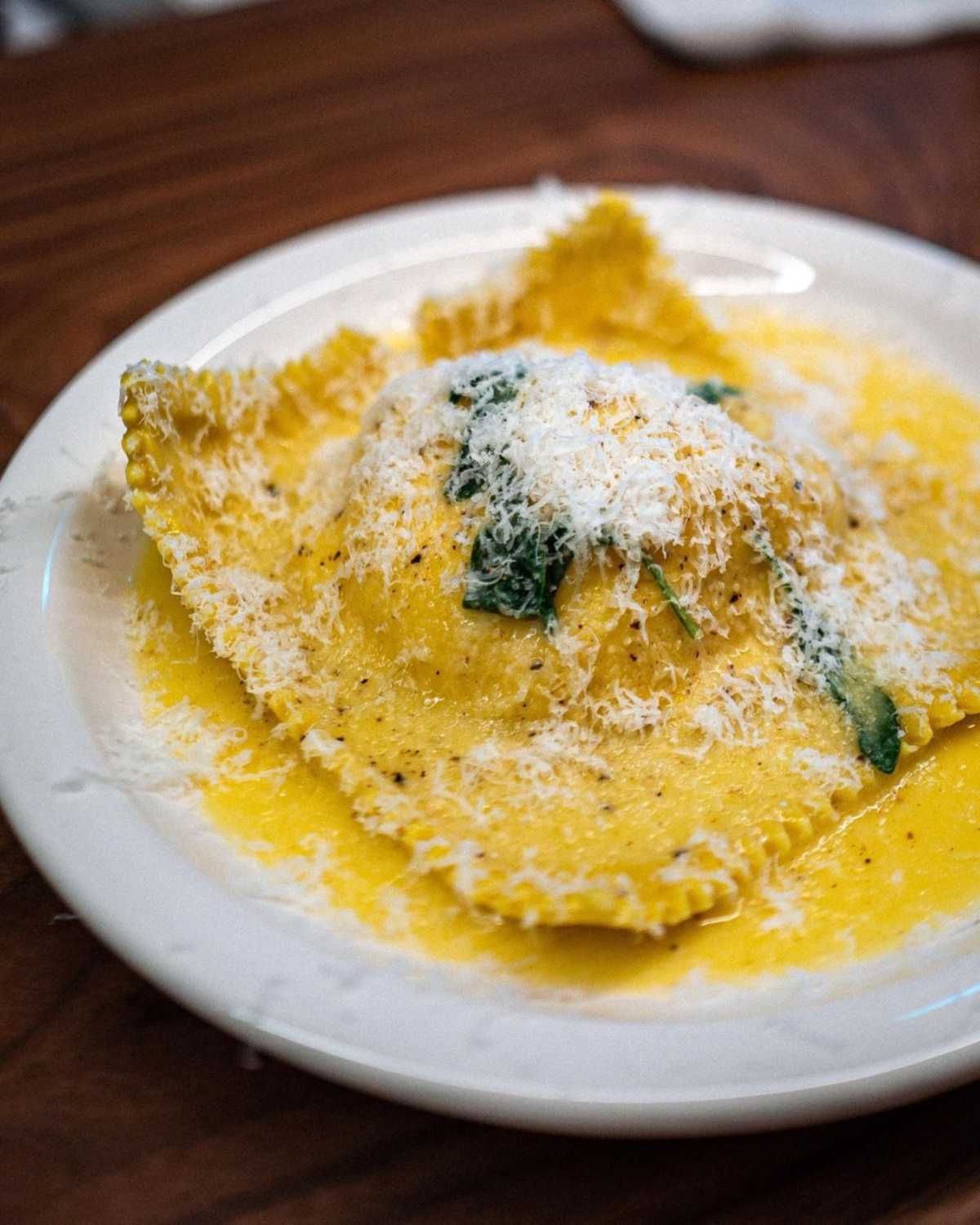A. ‘우오보 라비올리’. 넓적한 생면 속에 직접 만든 리코타 치즈와 유정란을 넣고 세이지 버터 소스를 더해 완성합니다.