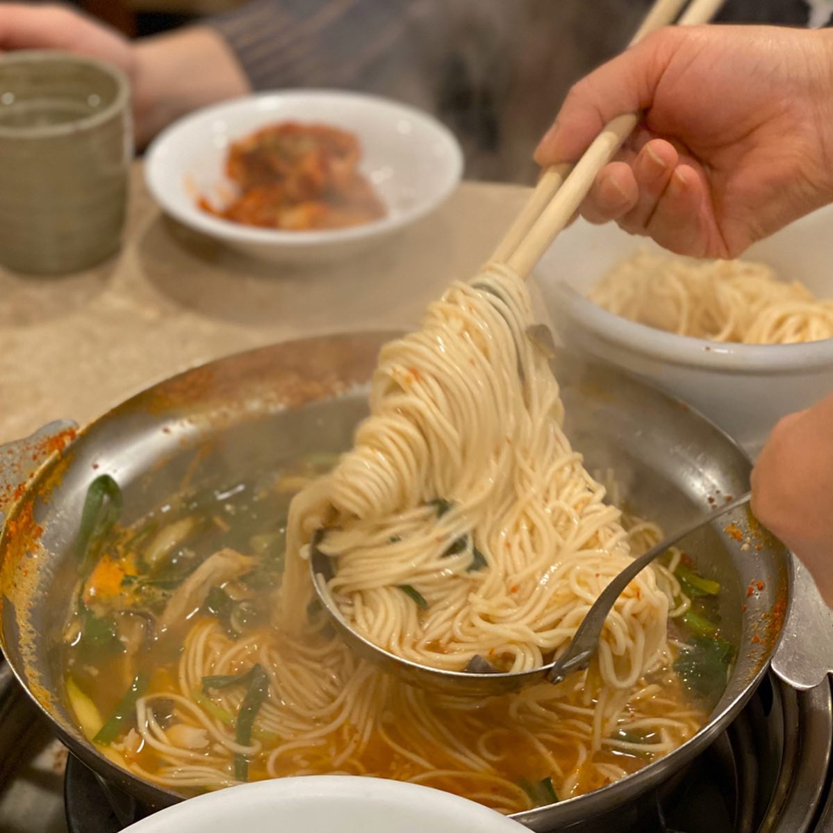 1976년부터 명동과 무교동 일대에서 명성을 떨쳐온 국수 전문점입니다. 테이블 위에서 직접 육수에 면과 야채를 넣고 끓여 먹는 얼큰한 ‘전골국수’가 대표 메뉴입니다. 한우가 듬뿍 들어간 깊은 맛의 고기 육수에 얇고 부드러운 자가제면 국수가 어우러져 고급스러운 풍미를 냅니다. 국수를 다 먹은 후 남은 국물에 끓여 먹는 죽은 배가 불러도 포기할 수 없는 별미입니다.